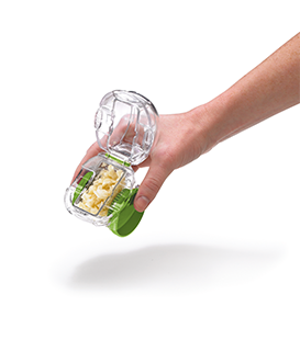 Der Knoblauchschneider von chef´n ist die ideale Lösung fürs Zerkleinern, ohne dass Hände und Arbeitsfläche mit dem intensiv riechenden Gewürz in Berührung kommen. Das handliche Gerät sieht aus wie eine durchsichtige Kugel auf zwei Rädern. Die geschälten Knoblauchzehen werden durch eine aufklappbare Öffnung ins Gerät gegeben. Durch Hin- und Herrollen bewegt sich ein Rädchen mit vier Edelstahlklingen im Inneren, wodurch die Knoblauchzehen zerkleinert werden.