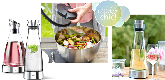 Die FLOW Kühlkaraffen mit integriertem Kühlakku in Kombination mit passendem Flaschenkühler und Eiswürfelbehälter verleihen jedem gedeckten Tisch ein Hauch von Eleganz. In Kombination mit den ACCENTA Salatschalen aus schickem Edelstahl und integriertem Kühlakku wird der Salat zu einem echten Hingucker und bleibt auch bei längerem Transport knackig frisch. Und auch die Zubereitung des Salats geht mit der praktisch-eleganten TURBOLINE Edelstahl Salatschleuder im Handumdrehen.