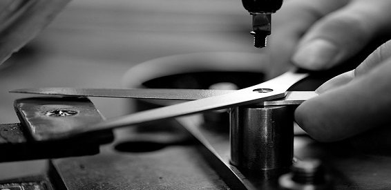 Dieser wird gestanzt, gehärtet und gerichtet, bis er unseren hohen Qualitätsanforderungen entspricht. Für die meisten Scheren setzen wir die Verbindungsschraube in spezielle Lager aus glasfaserverstärktem Polyamid. Diese Schraubverbindung haben wir selbst entwickelt, sie ist elastisch, verschleißfrei, gibt der Schere den notwendigen Halt, und lässt sich nachjustieren. Nachhaltigkeit ist uns sehr wichtig: Ein Fachmann kann die Schraube lösen und die Schere nachschleifen – so gewinnt sie eine außerordentlich lange Lebensdauer.