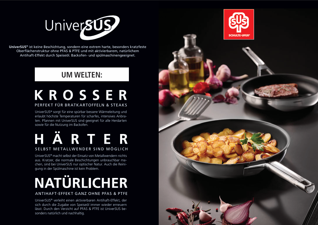 Die UniverSUS®-Pfanne von Schulte-Ufer vereint natürlichen Antihaft-Effekt, extreme Härte und höchste Hitzebeständigkeit – ganz ohne PFAS oder PTFE! Metallwender? Kein Problem! Spülmaschinenfest? Natürlich! Und das Beste: langlebig und ressourcenschonend.